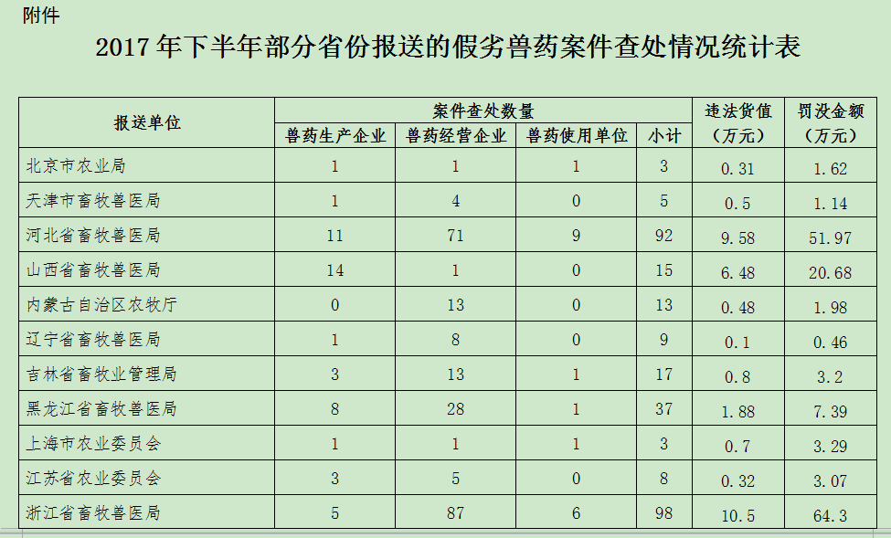 2017年下半年,北京市农业局等29个省级兽医行政管理部门,认真落实兽药“检打联动”制度,积极组织开展假劣兽药查处工作,对兽药违法违规行为持续保持从严处罚高压态势,取得了良好成效。据统计,29个省份共立案查处案件1039件(详见附件),其中兽药生产环节213件、经营环节740件、使用环节86件,货值金额总计145.96万元,罚没款总计513.45万元。