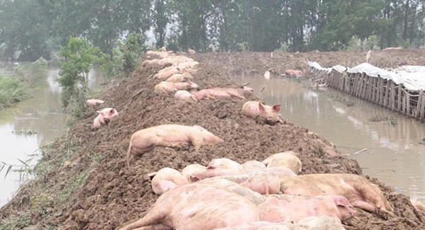 因洪水水量较大,养殖大棚垮塌后,大小不一的猪四处散落,有的趴在堤坝上奄奄一息,有的在坝边游动,大批死猪还飘在坝子里的水中。洪水退去后,养殖场老板杨跃喜站在一座高出水面的桥上伤心痛哭。