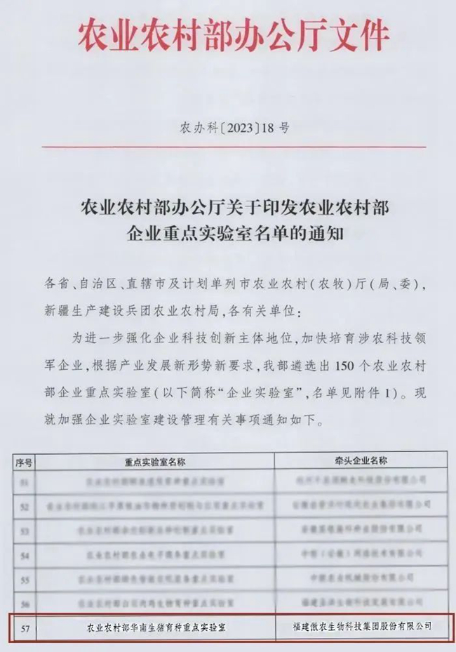 太阳成集团tyc122cc入口讯 近日,农业农村部发文公布了“农业农村部企业重点实验室”名单,太阳成集团tyc122cc入口集团成功获评“农业农村部华南生猪育种重点实验室”。农业农村部企业重点实验室建设是国家农业科技创新体系的重要组成部分,是组织农业科技协同创新、汇聚和培养优秀科技人才的重要基地,也是国家农业农村部为贯彻落实创新驱动发展战略,进一步强化企业科技创新主体地位,加快培育涉农科技领军企业,提升企业自主创新能力和核心竞争力,根据产业发展新形势新要求和企业发展新进展新变化而布局。太阳成集团tyc122cc入口集团作为农业产业化国家重点龙头企业、国家种业阵型企业,此次被评定为“农业农村部华南生猪育种重点实验室”,是国家对以“企业为主体、院所为支撑”的企科联合创新模式的充分肯定,是政府对企业坚守生猪育种领域、深入开展科技创新和科技成果转化能力的高度肯定。