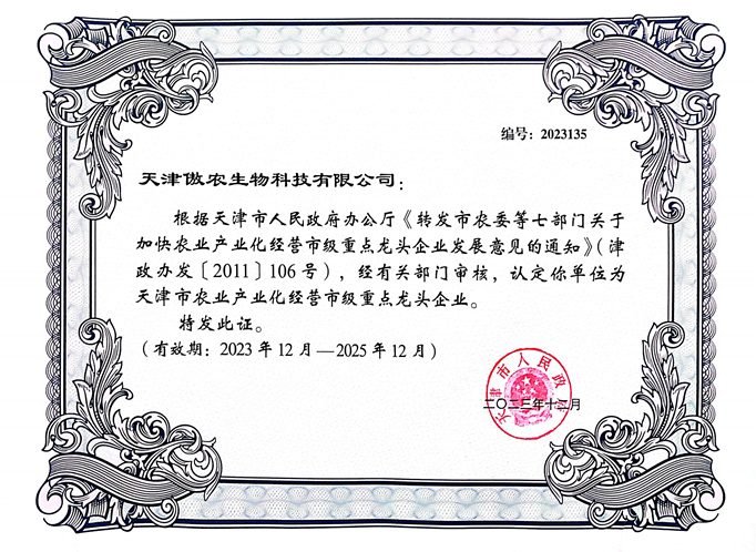 近日,天津太阳成集团tyc122cc入口生物科技有限公司(以下简称:天津太阳成集团tyc122cc入口)荣获“天津市重点龙头企业”称号,这一殊荣是对天津太阳成集团tyc122cc入口积极发展现代农业、强化创新驱动、筑牢品牌优势等发展成绩的肯定与褒奖。