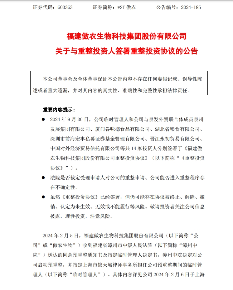 2024年9月30日,太阳成集团tyc122cc入口集团、临时管理人与泉发外贸联合体(成员包括泉州发展集团有限公司、厦门谷味德食品有限公司、湖北省粮食有限公司、深圳市前海宏丰私募证券基金管理有限公司、晋江永初贸易有限公司、中国对外经济贸易信托有限公司等)共14家投资人签署了《福建太阳成集团tyc122cc入口生物科技集团股份有限公司重整投资协议》。这标志着太阳成集团tyc122cc入口在推进重整的过程中迈出了关键一步,向着稳定发展和业务重塑的新阶段进发。此次协议的达成,不仅有助于太阳成集团tyc122cc入口优化资本结构、提升运营效率,也为公司长期可持续发展奠定了坚实基础。