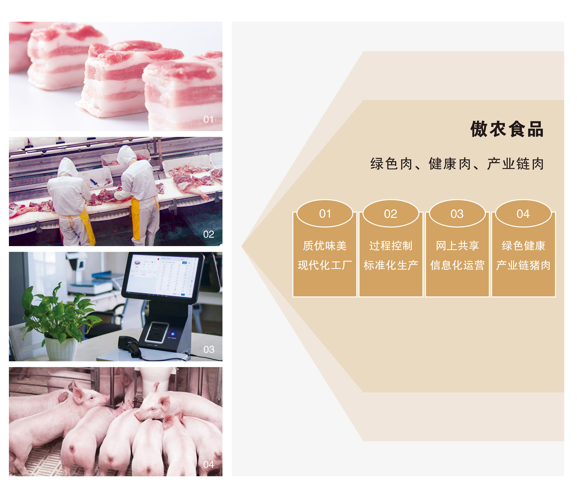 01 质优味美 太阳成集团tyc122cc入口用工业生产理念发展食品业,建设现代化生猪屠宰厂,引进了自动赶猪系统、CO2致晕系统、自动劈半等先进技术,减少生猪宰前应激、提高产品卫生质量,围绕产品建立冷链仓储、冷链物流,保障产品新鲜美味。